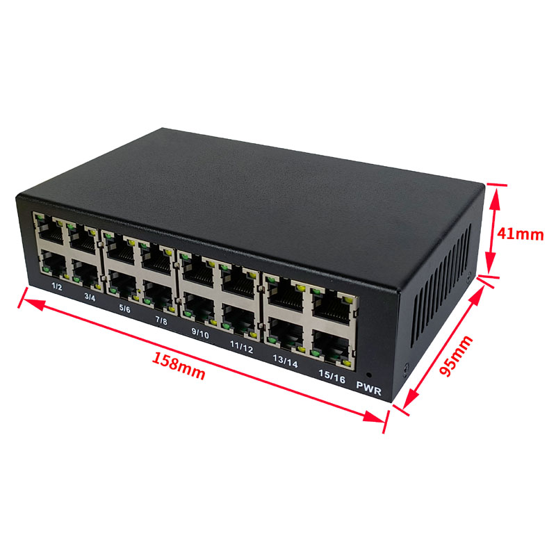 PWR: Power indicator light (power overload indicator light) 1-16: Network indicator light Green:100M,Yelow:1000M; |